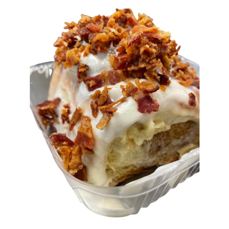 Our Giant Cinnamon Roll got a little better! What can possibly make our cinnamon rolls better you ask! Bacon spread on the top of our delicious made in house frosting. That's what!